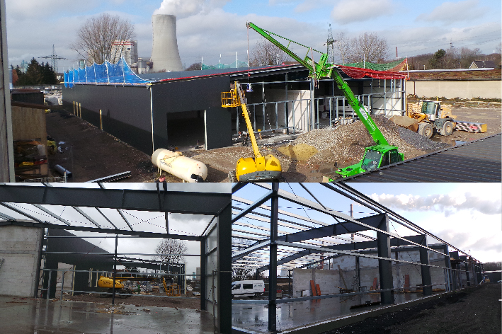 Die Halle Spannt Stützenfrei 30,72 m mit einem Leichtbau in Stahlskelettbauweise - Lichte Höhe an der niedrigsten Stelle 4m und die Rolltore mit 3x3m für alle klein Transporter geeignet - Ausgeführt mit einer Energiespar-Bodenplatte (Betonaktivierung), Fußbodenheizung - Stahlrahmenkonstruktion nach DIN 18800-7Grundwerkstoffe: Stahl S235 – S355 gem. DIN EN 10025 und Bauregelliste - Wandpanelle aus Hochleistungspanelle gemäß DIN EN 14509DIBt Berlin mit 0,19 W/m²kSchalldämmmaß ca. 25dB - Dachpanelle aus Hochleistungspanelle gemäß DIN EN 14509DIBt Berlin mit 0,19 W/m²k Schalldämmmaß ca. 25dB - Fenster dreifach Verglasung mit ein Ug= 0,9 W/m²k Schalldämmmaß ca. 30 dB - Rechnerischer Gesamtverbrauch bei 78,1 kWh (m²a) nach EnEV 2014.